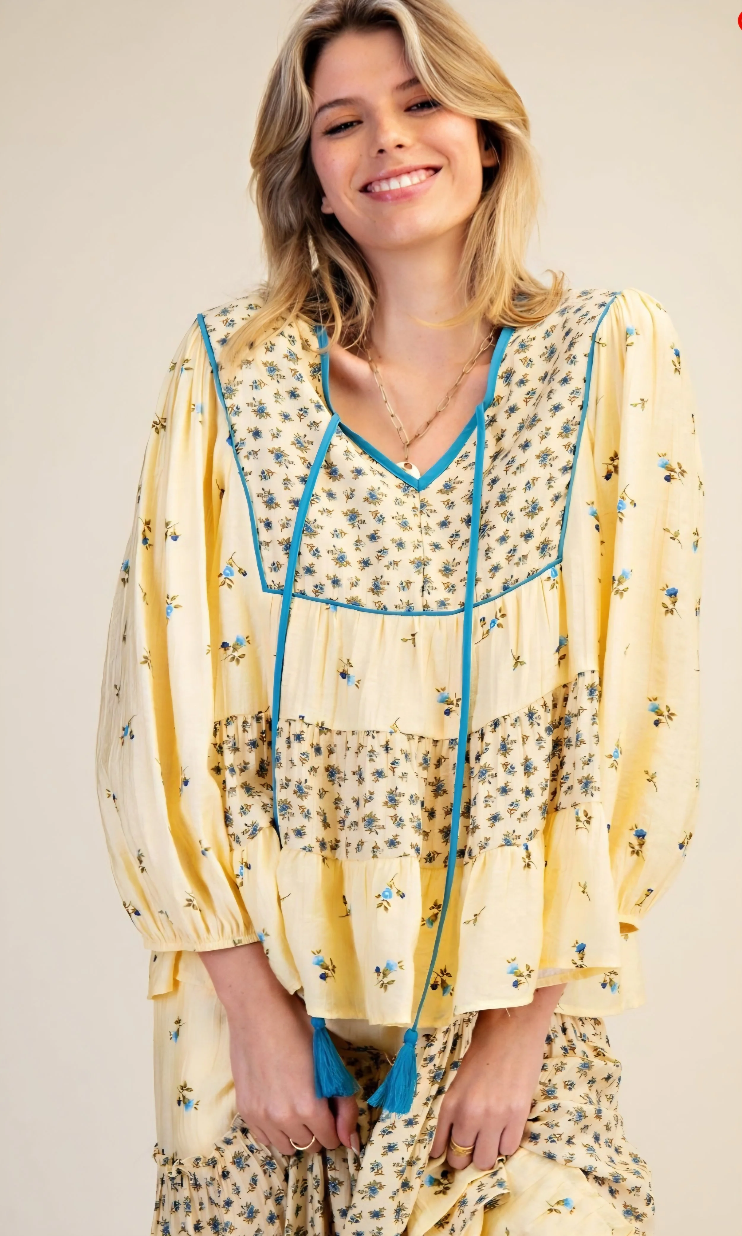 Introducing our Mix Print Peach Blossom Baby doll Top, a delightful peasant-style blouse designed for ultimate comfort and a flattering, generous fit. This charming top boasts a captivating mix-and-match print, featuring a beautiful tie adorned with a vibrant floral pattern in the most enchanting hues of buttercup yellow and serene sky blue. Embrace the effortless style and breezy feel of this summer essential, making it your go-to choice for sunny days and warm evenings. Skirt sold separately.