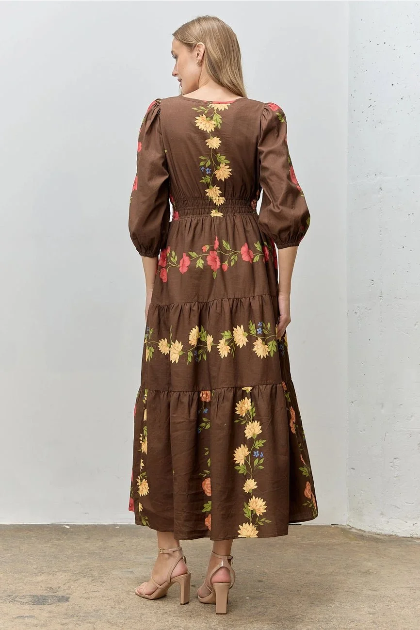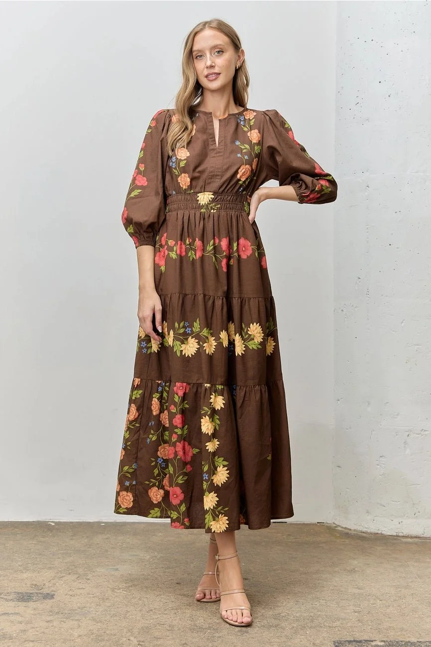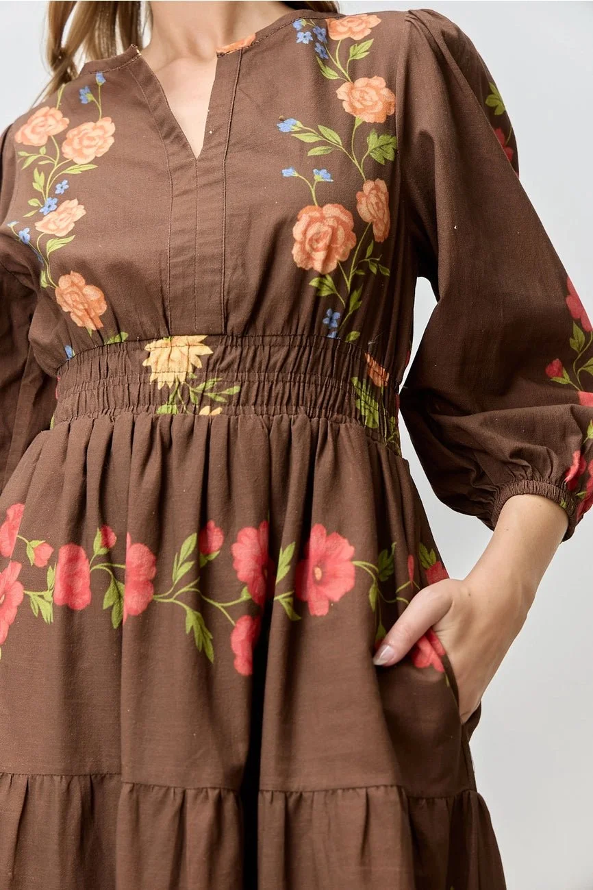 This stunning chocolate brown maxi dress features beautiful printed fall flowers in pink, peach, blue and yellow. The unique design and intricate details make it perfect for any fall occasion. We have included a variety of sizes to make sure everyone can find their perfect fit. No closures makes this the perfect pullover dress. Has pockets!!