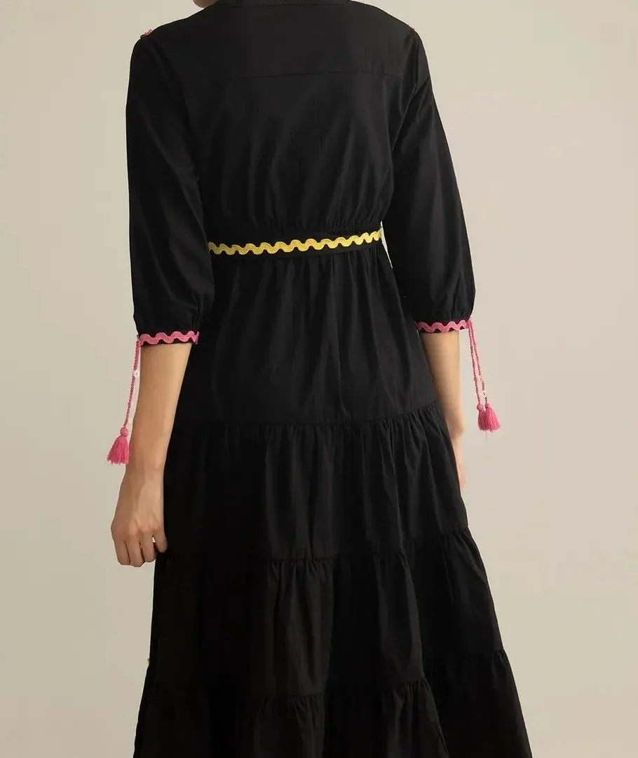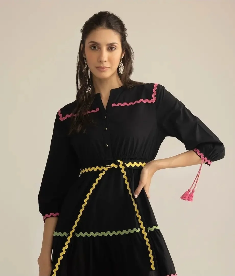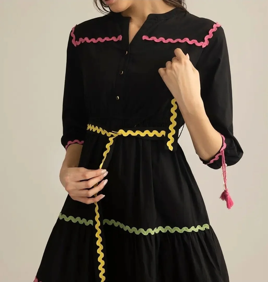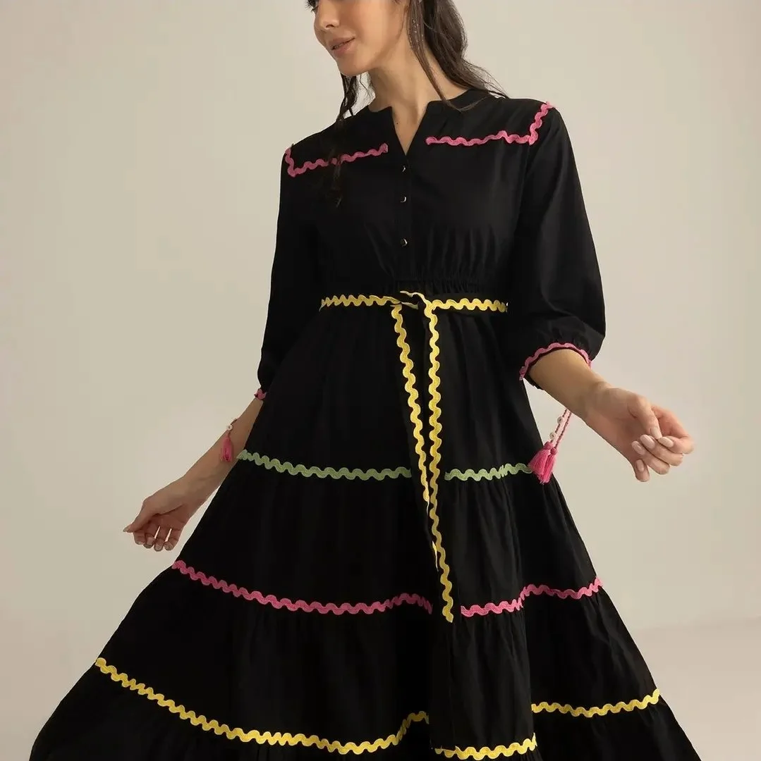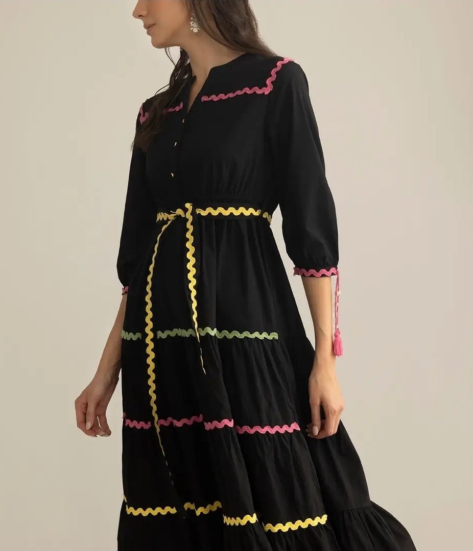 Take Your Everyday Looks from Casual to Iconic with Our Dress for Women Playful and full of personality, is a cotton maxi designed to move with you. Accented with vibrant ric-rac lace and finished with a flattering belted waist, this dress captures joy in every stitch. With its flowing silhouette and thoughtful artisanal detailing, it’s a bold expression of modern women clothing with a festive twist. Myra Maxi Dress Features Three-Quarter Length Sleeves